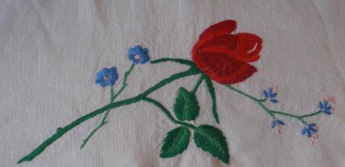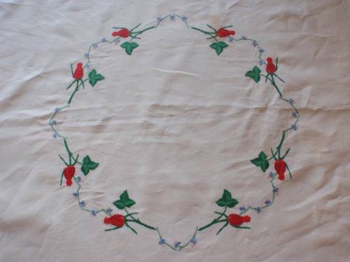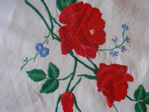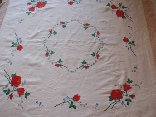 VINTAGE: LOVELY, LARGE LINEN TABLECLOTH - EMBROIDERED WITH RED ROSES AND EDGED WITH LACE. THIS IS MACHINE EMBROIDERED, LACE IS ALSO MACHINE MADE. THE CLOTH AND EMBROIDERY IS IN GOOD CONDITION - BUT PLEASE NOTE THAT IS HAS SOME STAINS (NOT BAD) SEE DETAILS BELOW. SIZE: 143CM X 145CM.
