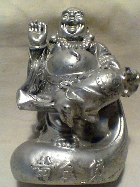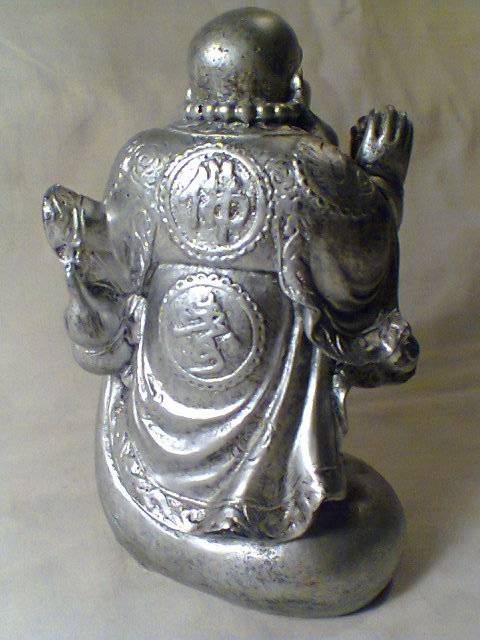Vintage Ben Zara Heavy Silver patina Laughing Buddha with money bag Statue Sculpture Signed.