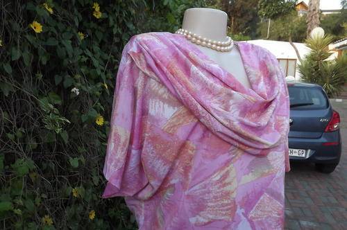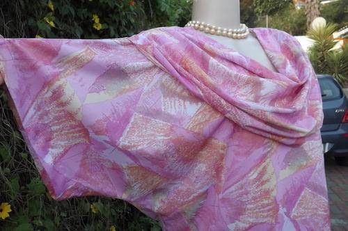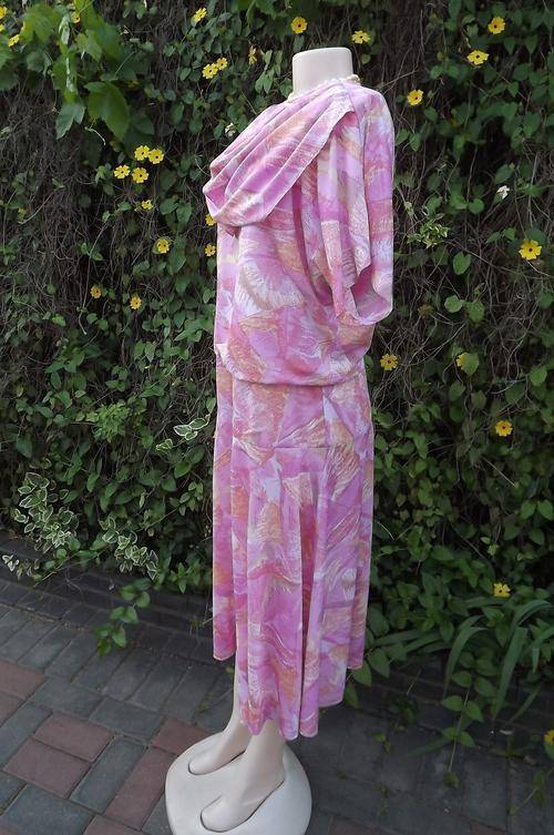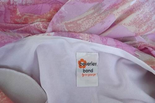 Vintage Beverley Bond geometric patterned size 42/18 dress in pinks.Flair yoked skirt.Top in blouson style with bib collar and cut-on sleeves.Still in good condition