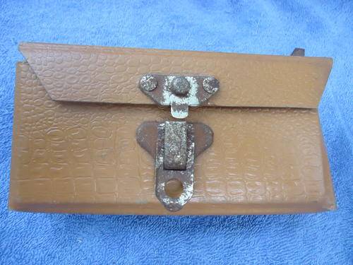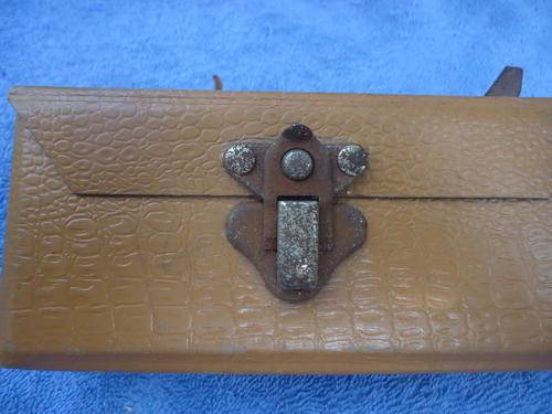 AND A TAN CARDBOARD SADDLE BAG WITH TARNISH ON THE CLASP