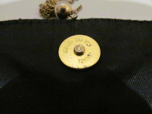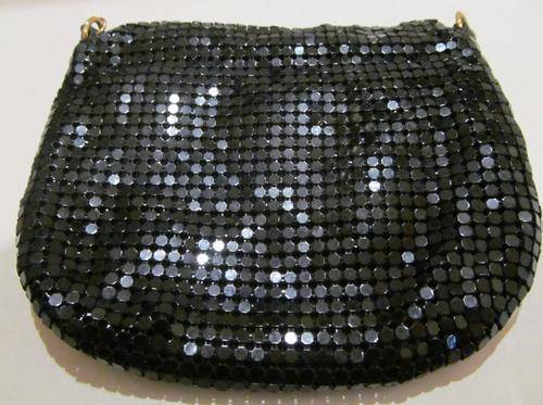 Lovely small black enamel mesh evening bag with mesh strap and tassel detail clasp in very good condition. Has a small stain at the bottom of the interior.