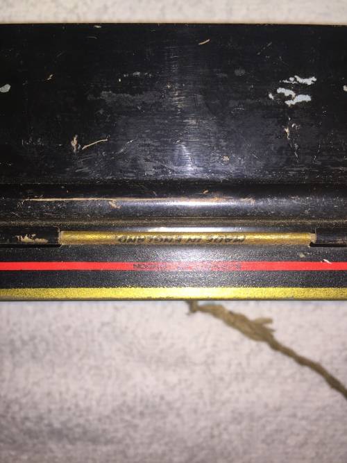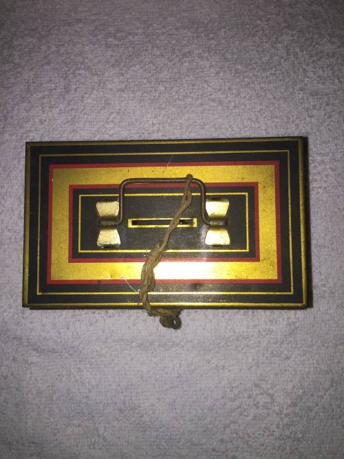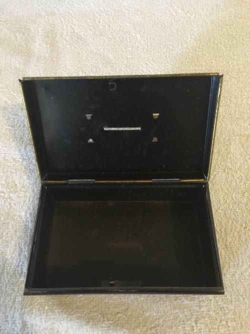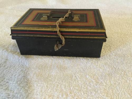 On offer here is an excellent vintage black and gold tin money box or cash tin. It is by Burnett lts London as shown on the back of the tin. It measures 15cm across by 6cm deep and stands 9cm wide. It is in good condition and still has its key very rareto see the key.