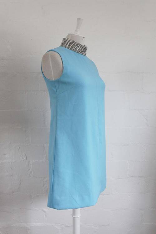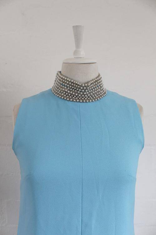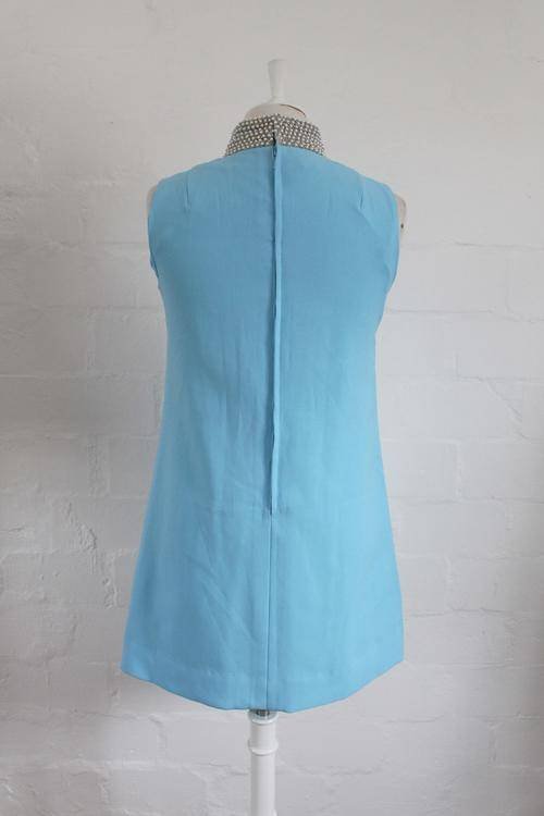 VINTAGE BLUE BEADED COLLAR SLEEVELESS SHIFT COCKTAIL DRESS - SIZE 10