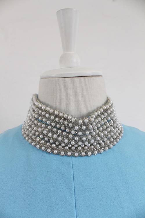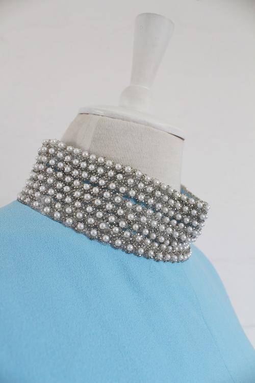 Truly beautiful quality authentic vintage shift cocktail dress with heavily beaded faux pearl high collar. Fully lined.
