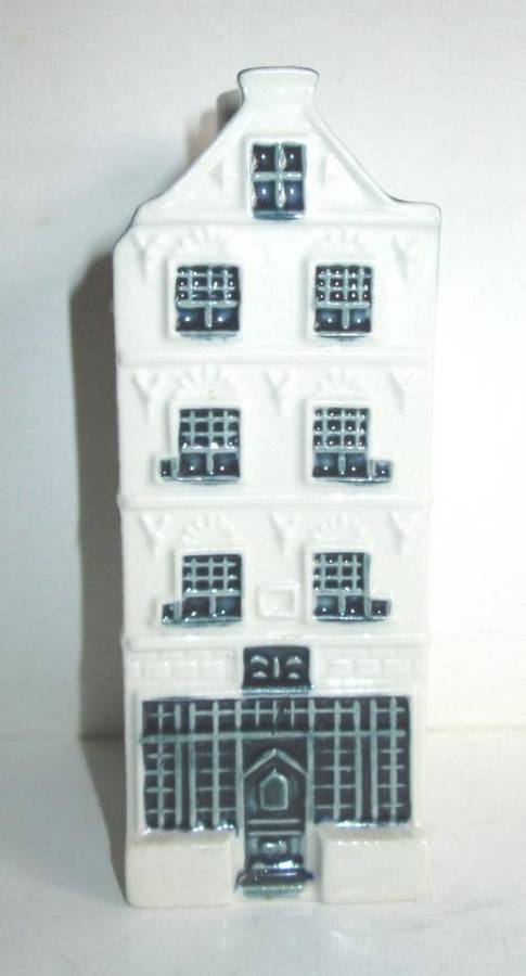 Vintage hand painted blue Delft's KLM Bols house no.28< Royal Distillers Holland, minor chip to base, 11.3 cm high.
