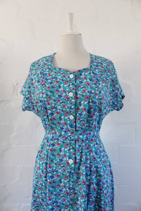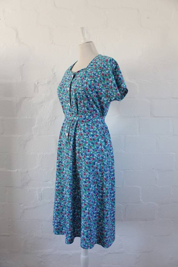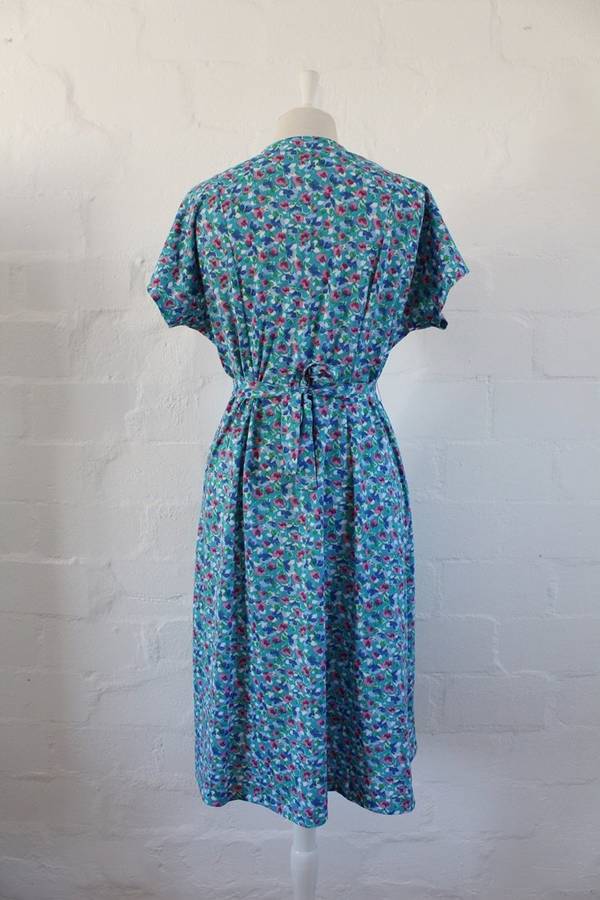 VINTAGE BLUE FLORAL PRINT TIE WAIST DAY DRESS - SIZE 16