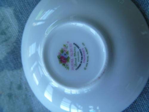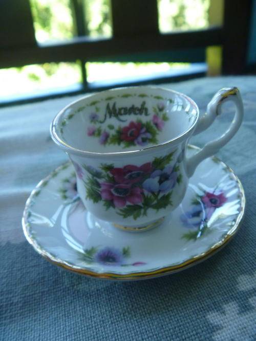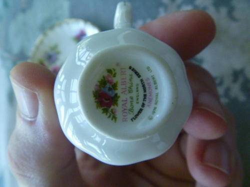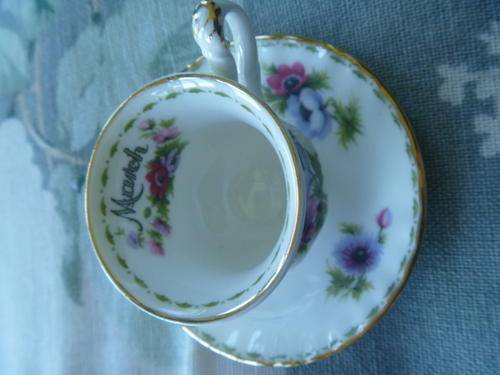 Here is a wonderful example of Royal Albert Bone China. This set is from the 1970 series “flower of the month”, and is the March cup & saucer “Anemones”. The cup and saucer are in excellent apparently unused condition. The cup measures 4 4/8" wide across the mouth, including the handle. It is 3 3/8" tall from the bottom up to the top of the handle.