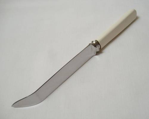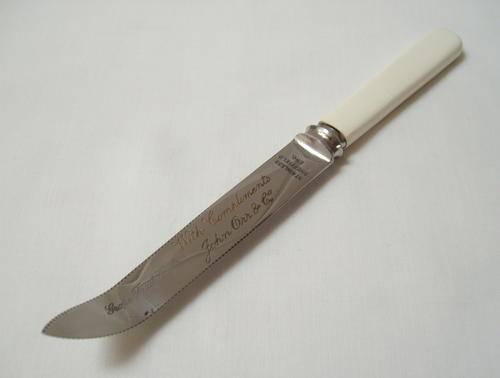 knife, with plastic celluloid ivory bone handle, blade engraved: With Compliments John Orr & Co.