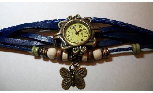 Vintage Bracelet Wristwatches Butterfly Women Blue Genuine Leather Strap