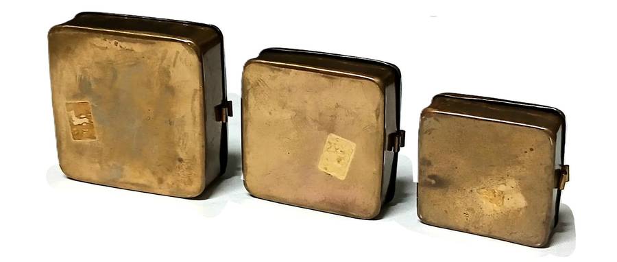 The largest tin (Maggots) measures 7.8cm x 7.8cm x 3cm, the medium (Worms) comes in at 7cm x 7cm x 2.2cm, and the smallest (Bait) is 5.8cm x 5.8cm x 1.9cm. All three are in good condition with no damage, but do show apparent signs of use as can be seen in the photos exactly what you'd expect from working tackle boxes of this era. While unmarked, this set was sourced in Ohio, USA, and has a distinctly Arts and Crafts feel in both material and design with warm brass tones, curved forms, and a handmade aesthetic that subtly echoes the tail end of the Art Nouveau period.