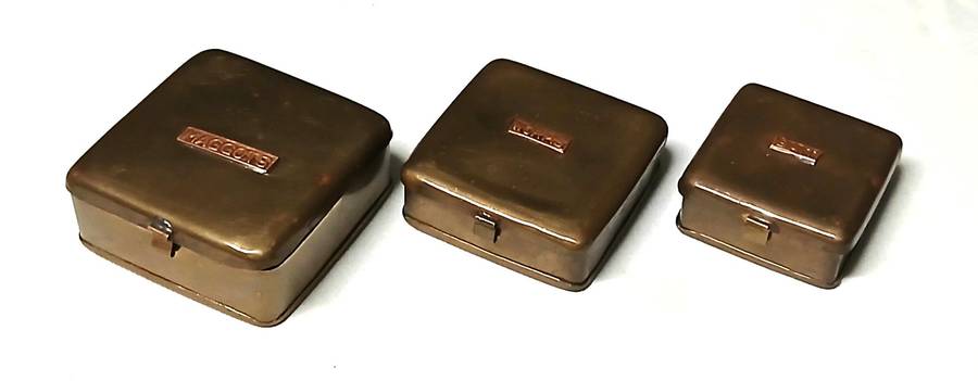 Vintage brass bait tins, fishing tackle box, maggots tin, worms tin, bait box, vintage fishing gear, nesting bait boxes, brass tackle storage, mid-century fishing tins, LouzAttic collectibles