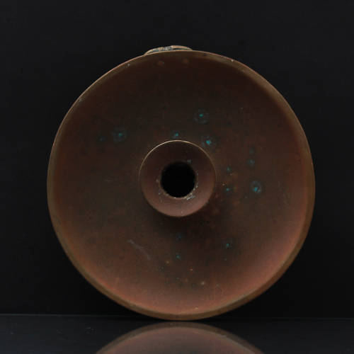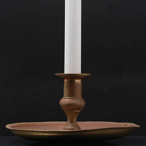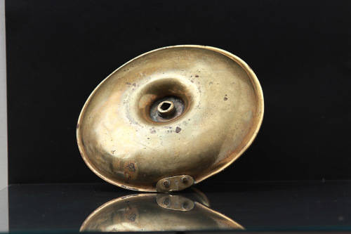 In worn condition with damage and tarnishing. The handle is missing and the rim is bent.