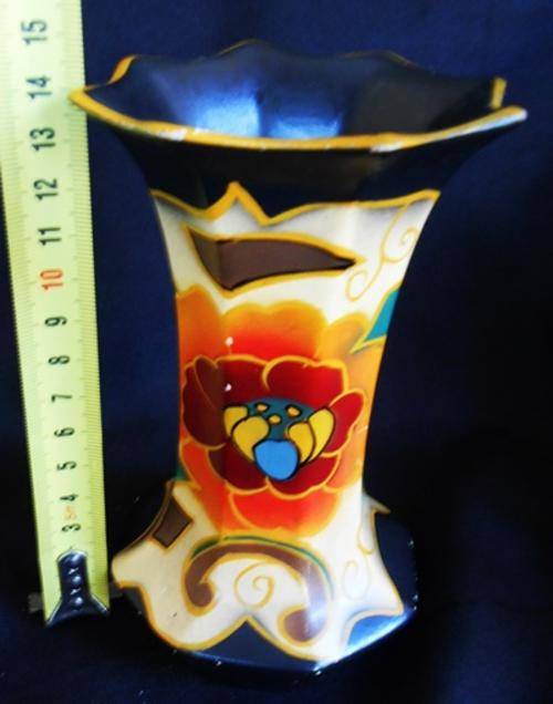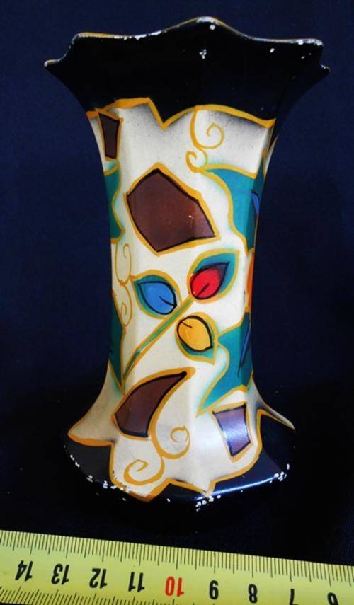 This is an interesting vase in good condition. There are no chips or cracks , only small white marks in the black around the edges. Please look at the photo’s
