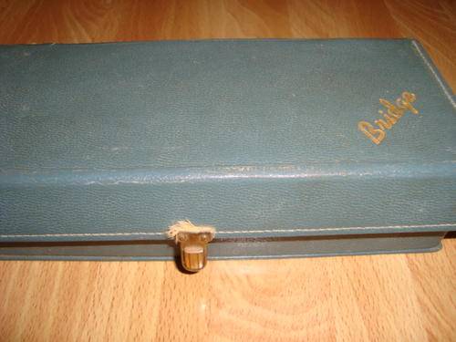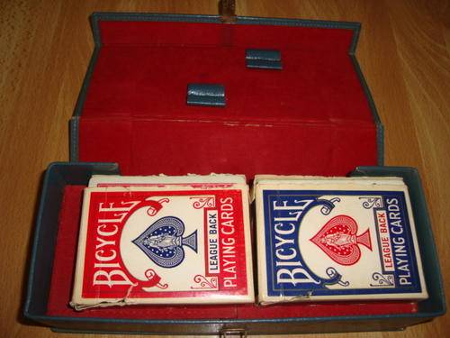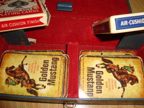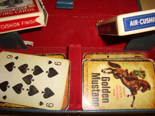VINTAGE BRIDGE HOLDER WITH GOLDEN MUSTANG AND BICYCLE PLAYING CARD.