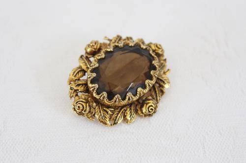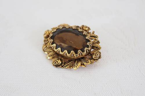 Beautiful authentic vintage brown glass faceted centre in gold tone setting.