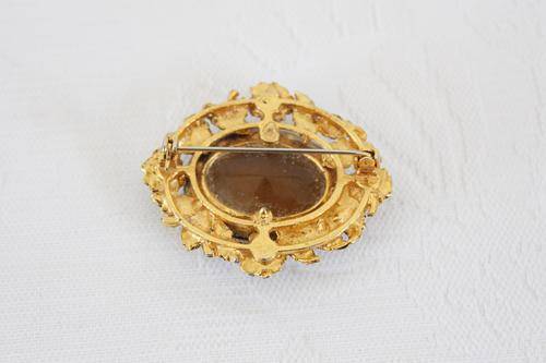 VINTAGE BROWN GLASS GOLD PLATED FLOWER BROOCH PIN