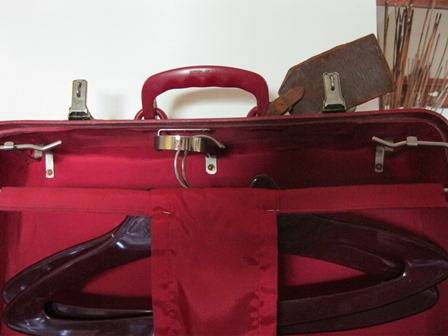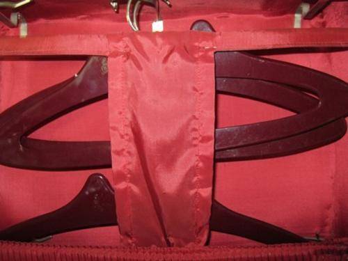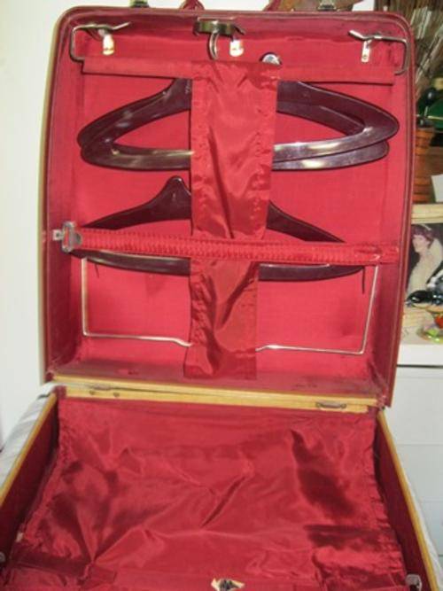 The Rev - Robe Wardrobe Suitcase made in England is of wooden construction covered with a tough coated Cotton Hessian, with red leather trim and red satin lining in the suitcase, comes with 3 shirt hangers/trouser hangers. The lids both come apart from the suitcase however i think that is how it was made.