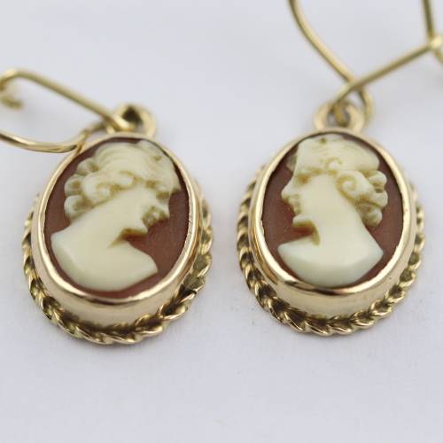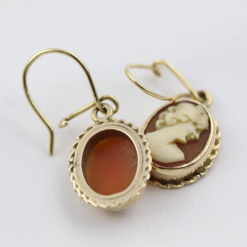 These vintage earrings are handcrafted in yellow gold, featuring the classic cameo profile in a creamy shell on a pale terracotta coral background, bezel set in the oval dangle element. A scalloped 9ct yellow gold frame to the bezel adds to the elegant gravitas of the piece. The earrings measure 2,7 cm (27mm) long (including the long hook) x 11,5mm wide and weigh a solid 3,7grams together. A classic accessory and a lovely piece of vintage England. They came from an antique jeweller in the heart of England's famous Jewellery Quarter.