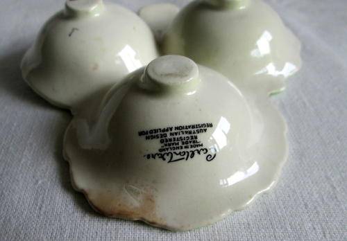 A lovely vintage green porcelain Carlton Ware open condiment dish, footed, chip free, some stain, size 13 cm x 11.5 cm x 2.5 cm.