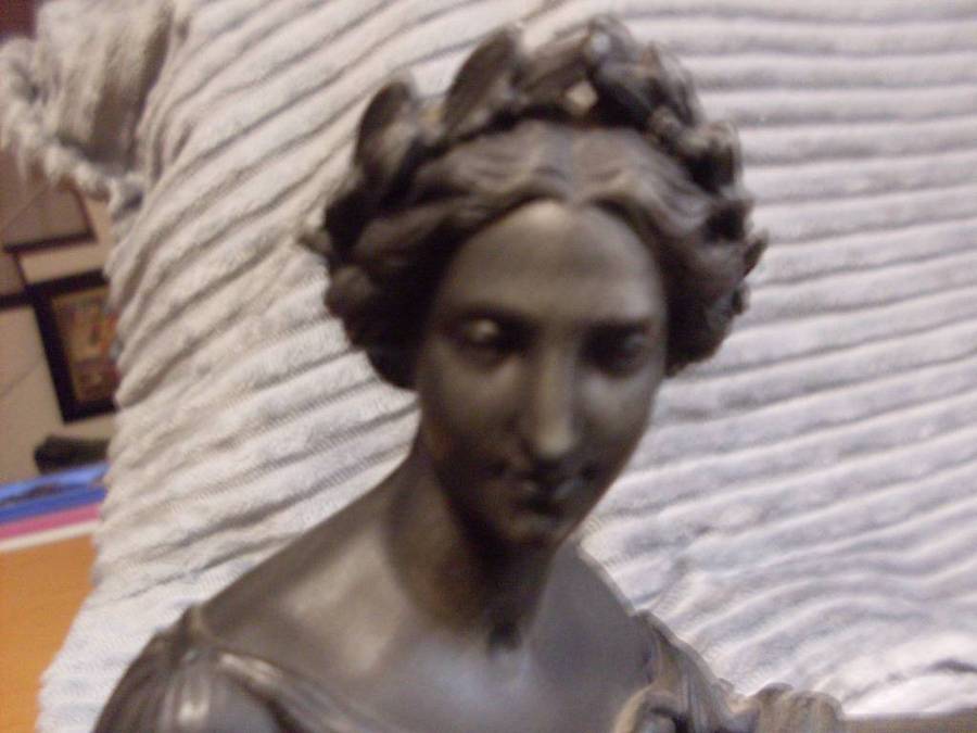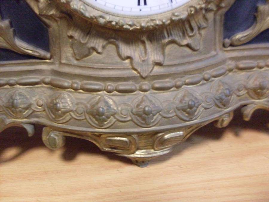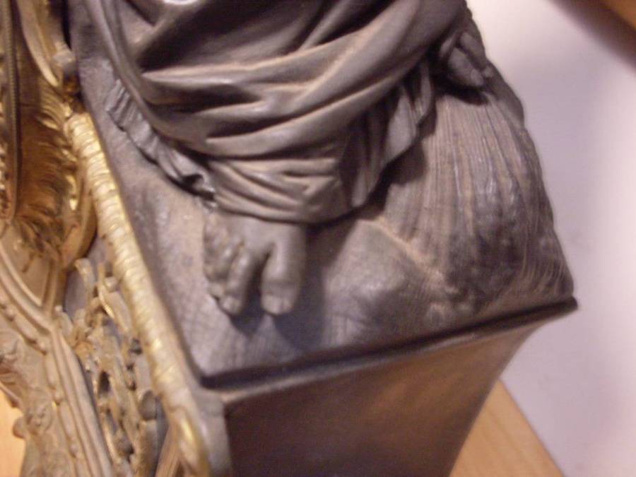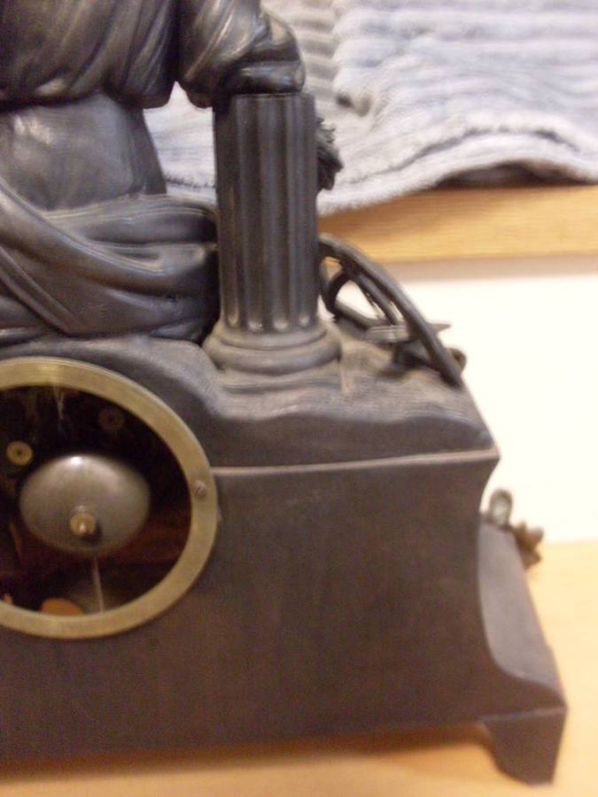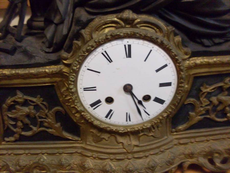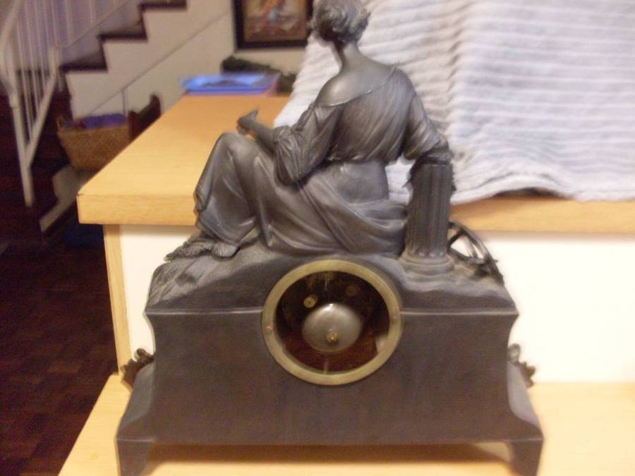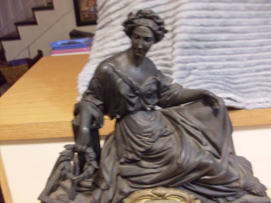 VINTAGE CAST IRON MANTLE CLOCK WITH SEATED LADY.(SOME GOLD METAL)..SEE DESCRIPTION HAS PENDULUM AND KEY SIZE IS 44 CM X 44 CM X 14 CM THIS MECHANISM IS VERY FRAGILE...BUT DOES WORK AND CHIME VERY GENTLY PLEASE NOTE NO FRONT GLASS OR BACK COVER.... HER LEFT HAND HAS A HOLE POSSIBLY TO HOLD SOMETHING WHICH IS MISSING THIS CLOCK WOULD NEED AN OVERHAUL