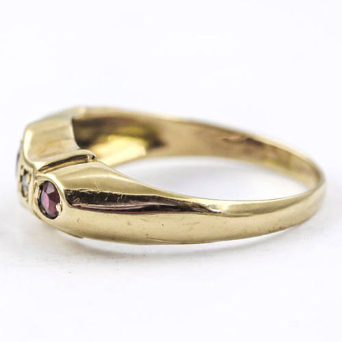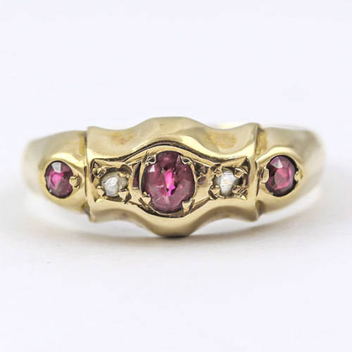 This vintage piece is handcrafted in 18ct yellow gold. This type of ring - 'Chester' design set specifically with rubies and diamonds - was a popular love ring soldiers would give their sweethearts before leaving for War. Rubies for love, diamonds for eternity... Unfortunately the date hallmark has worn off, but an independent jeweller dates it back to around World War 1 when this love token ring was popular. It may be later? The ring head features 3 x rubies in a gorgeous pinkish red colour, and flanking the largest, central oval-cut ruby are 2 x round-cut diamonds, and on either side of those are a round cut ruby. All the gemstones sit flush with the gold, and the sides are built up 18k gold, softly scalloped to follow the shape of the gemstones. The shank is narrow, bearing the hallmark 18K indicating 18ct gold and the royal crown for vintage British gold. The assay mark has worn away. The gold is in very good vintage condition - no chips, no noticeable marks, just gentle buff marks. The ring head measures 13mm across x 6mm wide x 2mm high and weighs 2,16 grams, and please note the ring side is particularly small - 4 1/2 ('I 1/2' in SA or British sizing). A very cute and rather special little English vintage collectable.