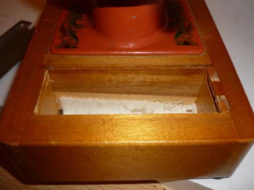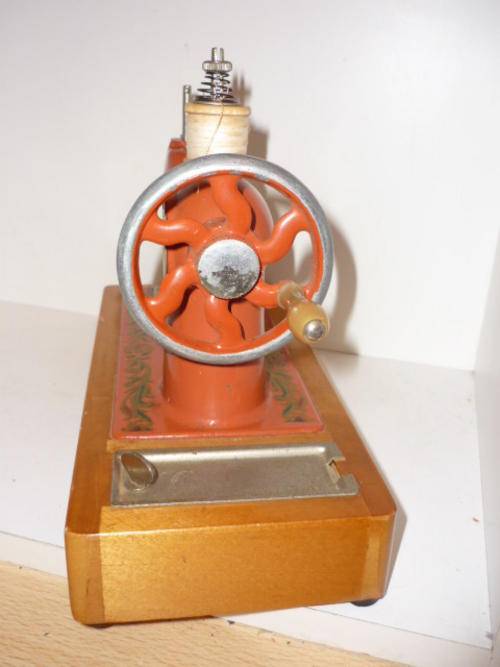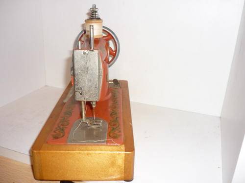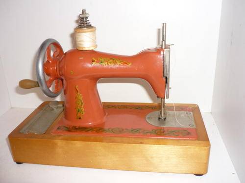 Soviet Child's Metal Sewing Machine: Made in USSR. Red Metal Body on Wooden Base. Working Condition. Hand Crank. Running Deer Logo and Floral Decals.