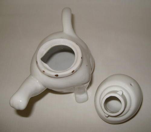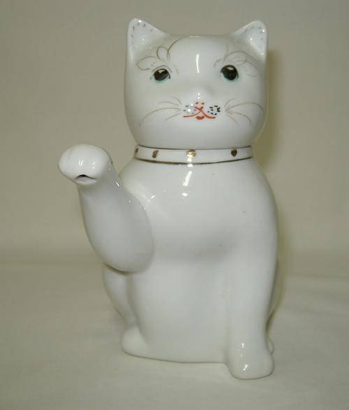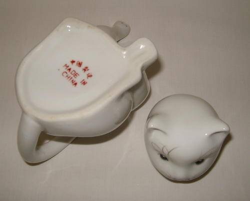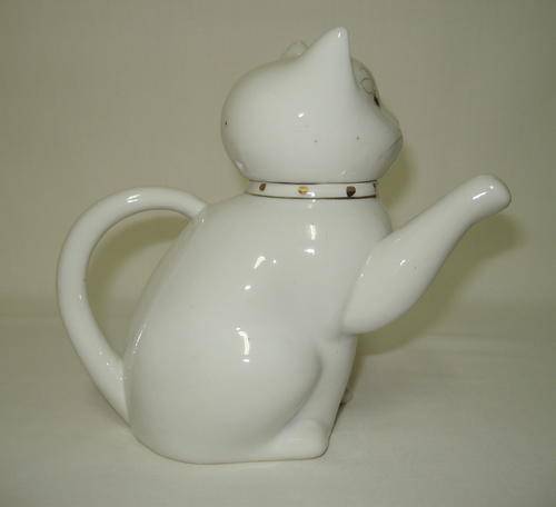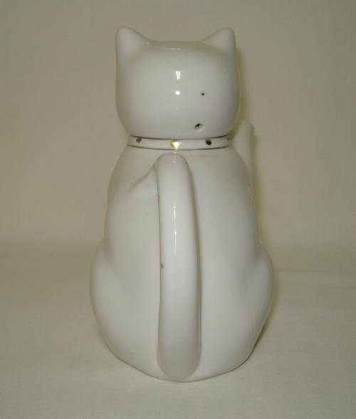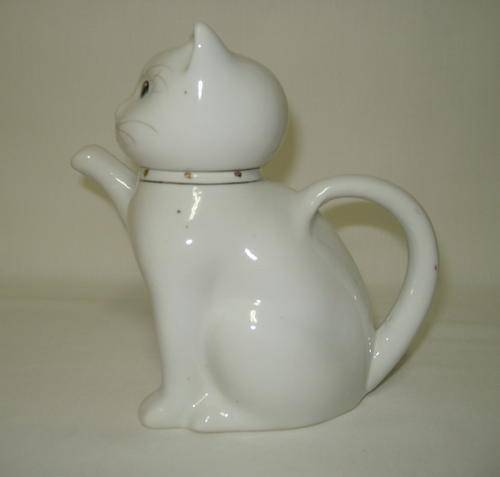 A white glazed porcelain one cup tea pot or creamer in the form of a cat