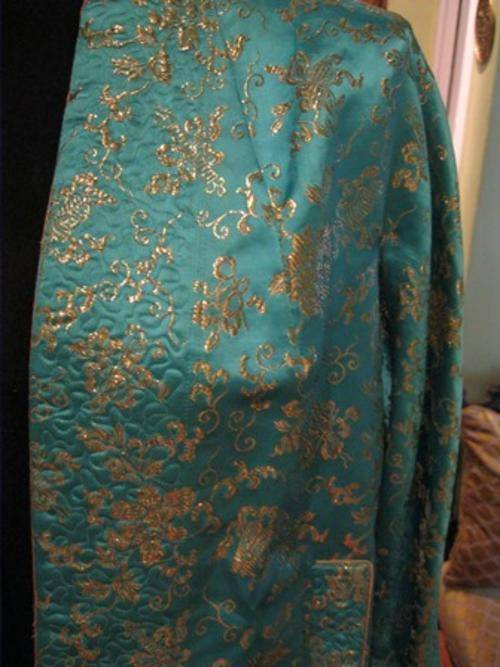 Vintage beautiful silk embroided reversible coat with side pockets in turqoise and gold and cream and beige on the reverse side a stunner for evening wear with a pair of pants will fit a size 34/36 the display does not do it any justice!!