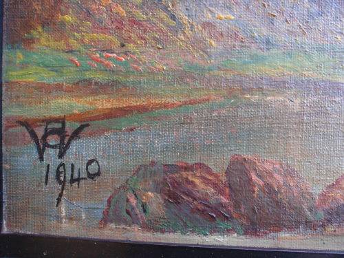 VINTAGE: CIRCA 1940 LOVELY ORIGINAL LANDSCAPE OIL ON CANVAS - IN ORIGINAL FRAME. SIGNED WITH ARTIST'S INITIALS & DATED 1940. SIZE: 41CM X 31CM (TOTAL SIZE INCLUDING FRAME OF 3.5CM IN WIDTH) HAS VERY OLD FRAMING LABEL ON BACK: T.S. TAYLOR PICTURE FRAMERS, 218 CHURCH ST. PIETERMARITZBURG.