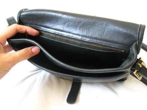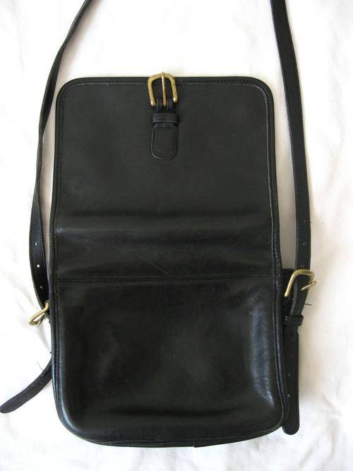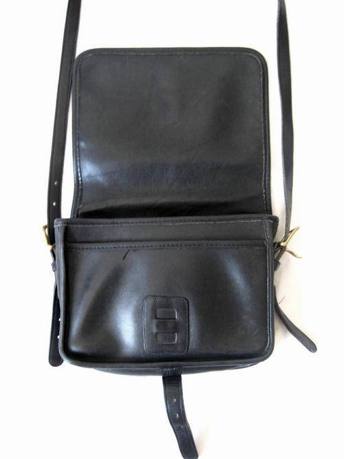 Authentic vintage. Made by Coach in the USA. Excellent quality, thick leather with brass hardware. One main section with front pocket and inner zip pocket. Some minor surface scuffs, but overall very good condition. 23 cm x 18 cm x 5 cm. Strap (adjustable) 113 cm.