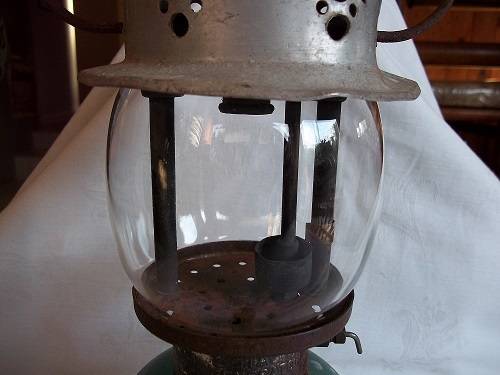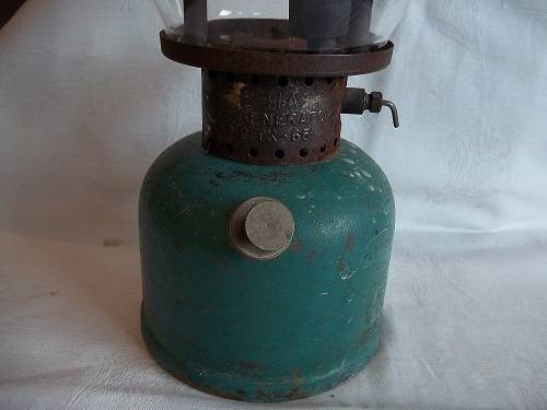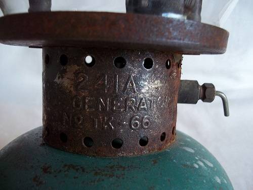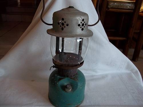Vintage Coleman No. 241A pressure lantern - quite rare. This old pressure lantern was manufactured in Canada, and has 11/57 on the fount indicating that it was made in November 1957. This is the A version with an aluminium hood. It is green, but seems to be brass underneath. It has all the traditional Coleman markings. The lamp is complete, and the glass shade is in perfect condition. The washer on the pump will need replacing. It is otherwise in fair condition for its age. Great buy for the collector.