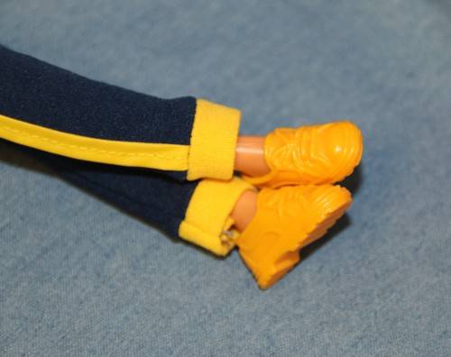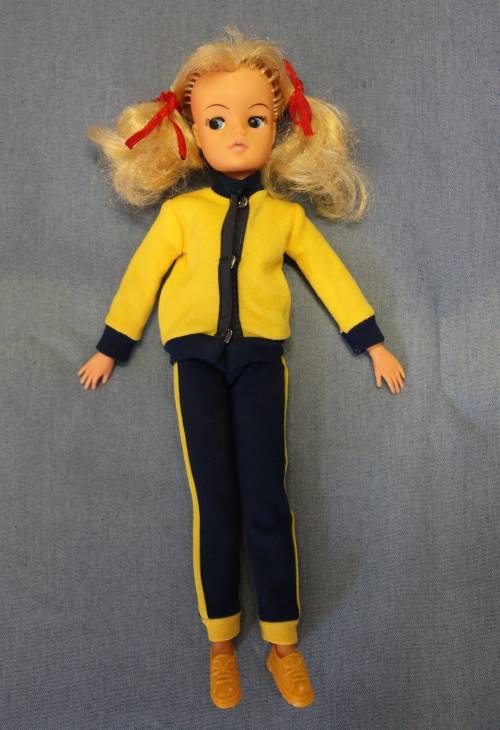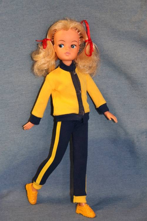 Sindy’s tracksuit forms part of the Keep Fit Sindy Collection. It is made from golden yellow and navy blue stretch nylon. The long-sleeved tracksuit top is made in golden yellow with the collar, cuffs and waistband made from navy blue stretch nylon. Sewn down the side of each leg is a stripe of yellow nylon tape. For her feet Sindy wears a pair of original golden yellow trainers.