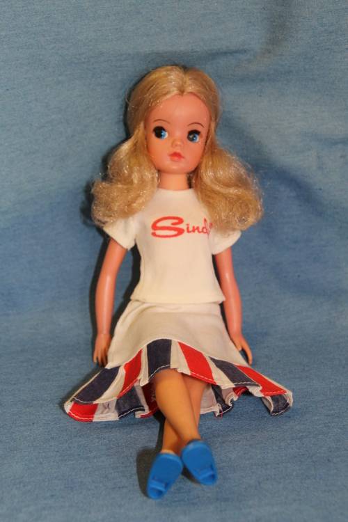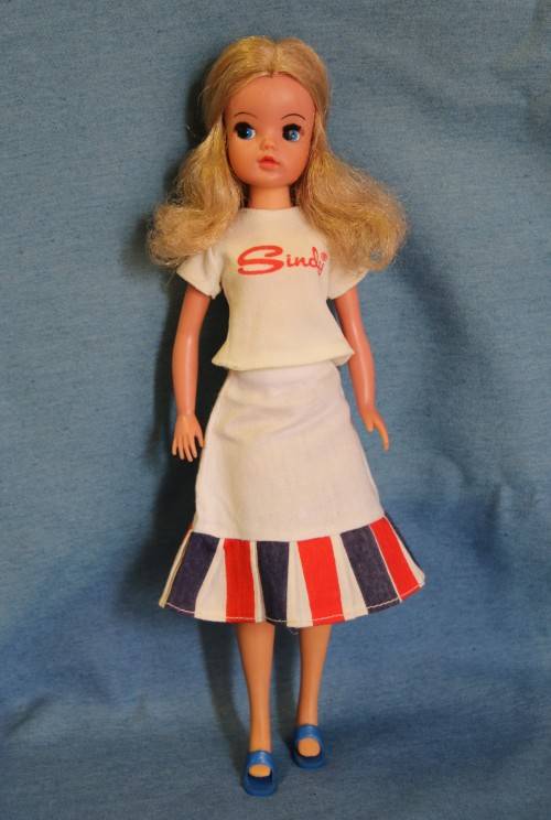 Sindy’s outfit consists of a Weekender skirt and is made of thick white twill-type cotton and attached around the hem is a ruffled frill of the red, white and blue cotton sewn with the stripes on the vertical. She also wears a white nylon short-sleeved T-shirt top printed with the Sindy logo in red. For her feet Sindy wears a pair of original blue open toe sandal shoes.