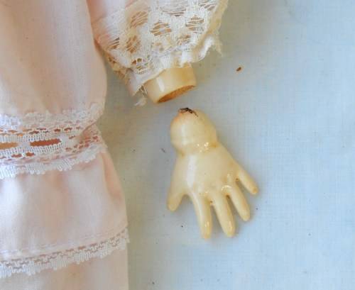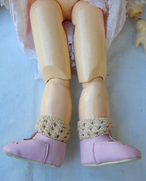 This doll has a hard body. Legs and arms are jointed. Upper legs and arms seem to be made of wood. The face is hard plastic. The doll has a wig glued onto its head.