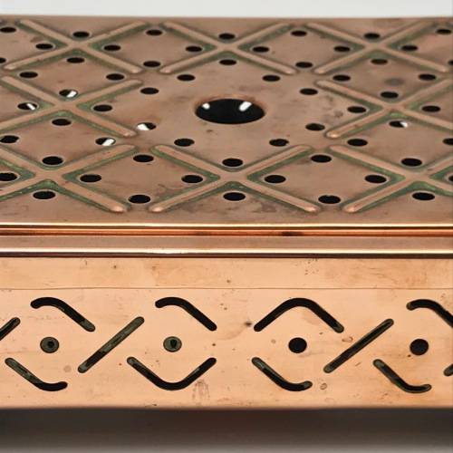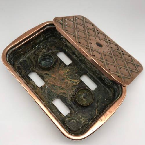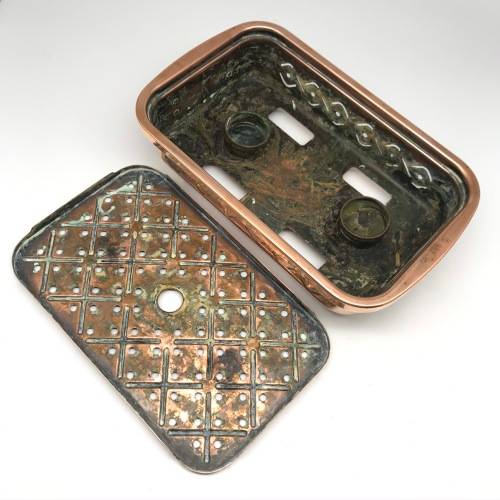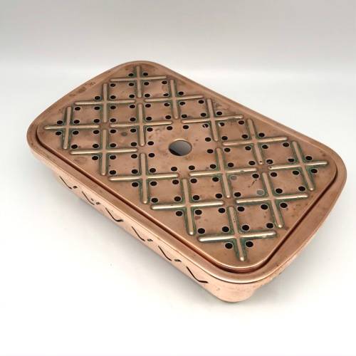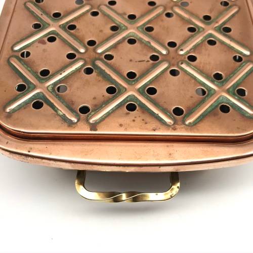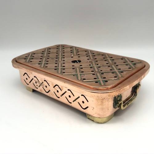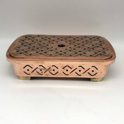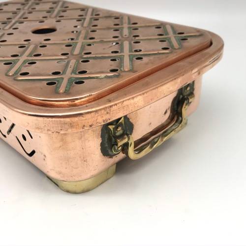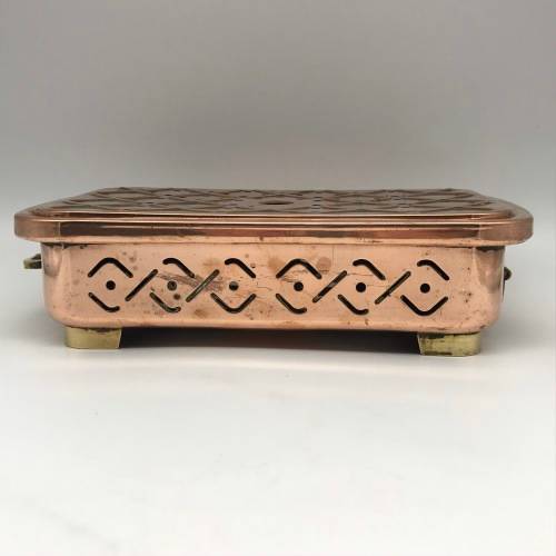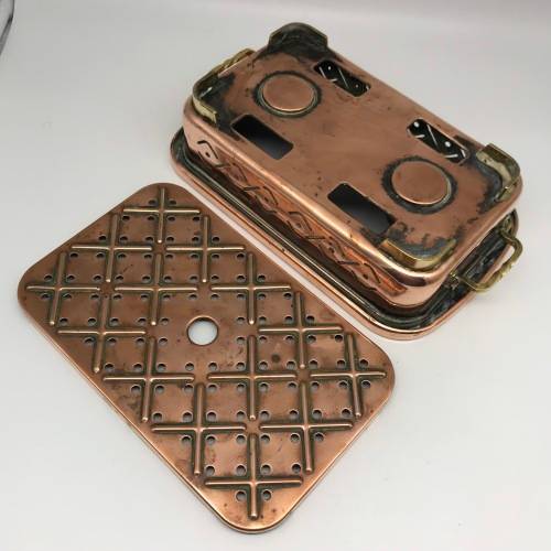 This early, very good quality, two-piece copper food warmer has two brass swing handles and stands on four small brass feet, with fittings for two tea lights inside. Other than interior signs of old usage, it's in great condition with a lovely polished rich copper colour. The food warmer measures 29,4cm x 18cm, stands 7,5cm high and weighs 1,1kg.