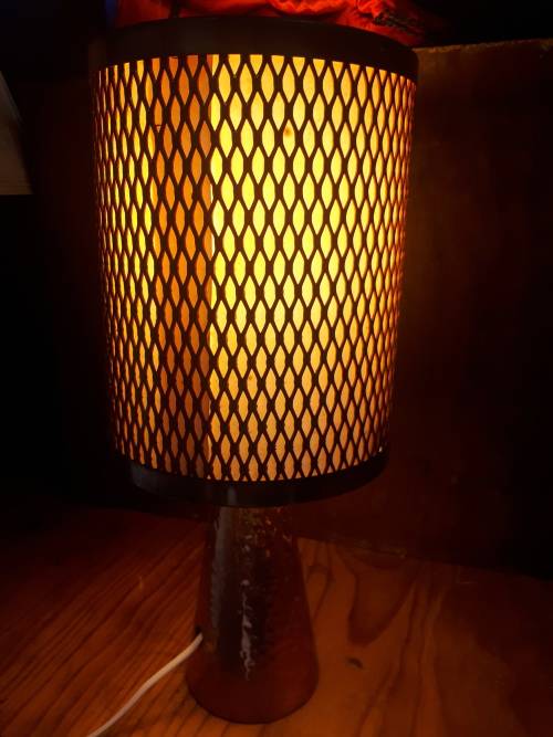 In really good condition for age. Only 2 of the support struts inside the copper shade are lose and need to be soldered. Lamp stands approx 34cm tall
