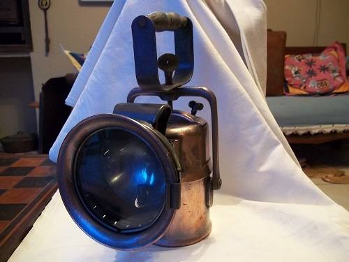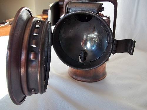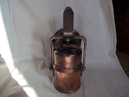 Vintage copper miners/ railway carbide lamp - great condition. I would estimate that this old carbide lamp is from the 1930/40s, and would have either been used on the mines or railways. The lamp is completely manufactured from copper - first time I have seen this. The lamp is large measuring 26cm x 17cm. The lamp is in great condition - lamp is complete and glass is unblemished. Clip, bracket and hinge in good working order. Great buy for the collector of vintage carbide lamps.