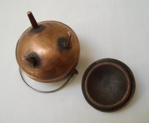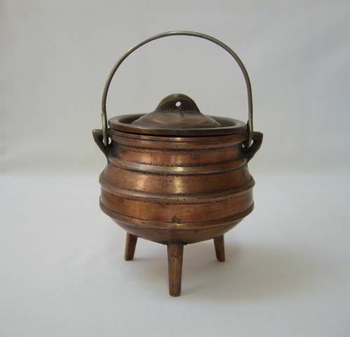 A copper plated cast iron miniature three-leg cauldron pot and cover.