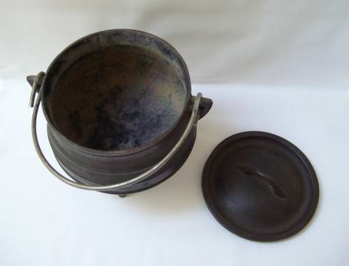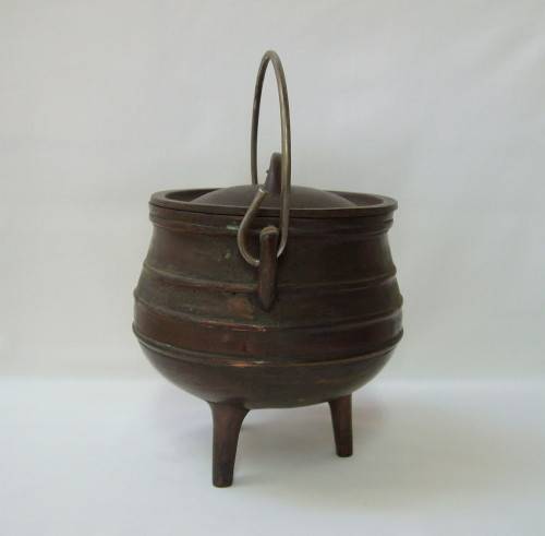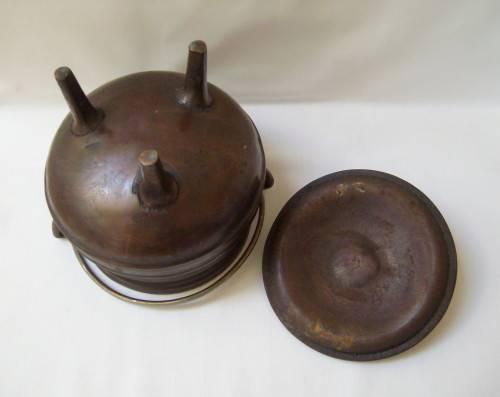 A copper plated cast iron small three-leg cauldron pot and cover.