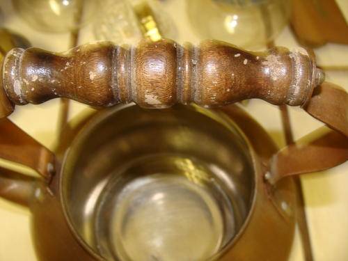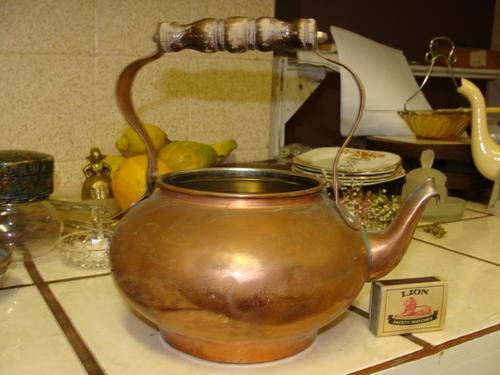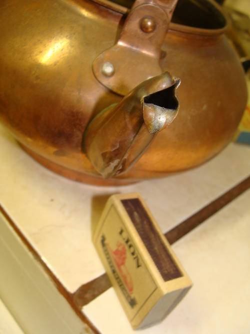 LOVELY OLD COPPERED KETTLE WOODEN HANDLE* & LID *SPOUT SQUASHED AND BODY* DINGED OXIDATION