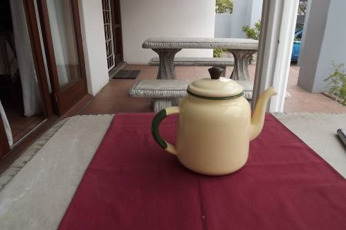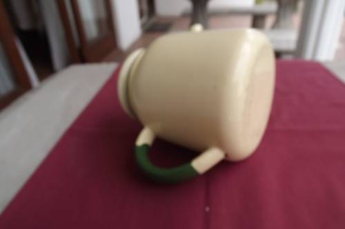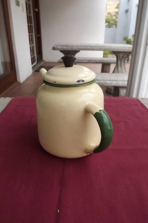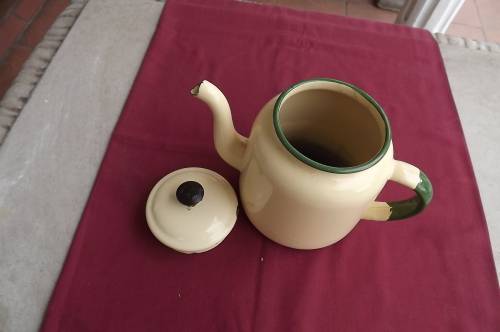 Vintage cream colour enamel teapot and lid with green rim.Inside show usage.