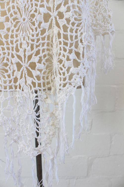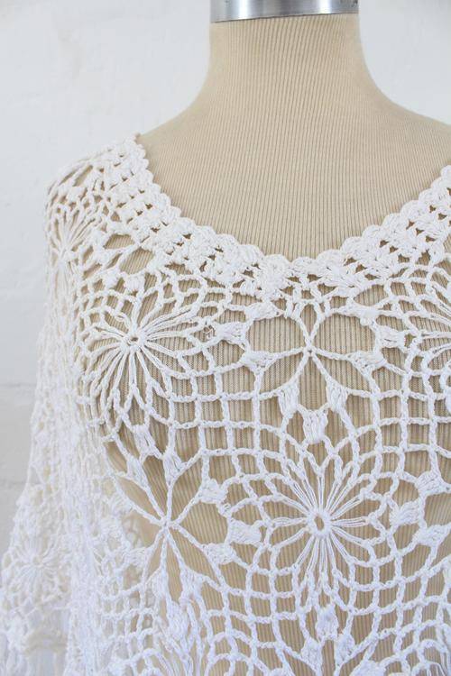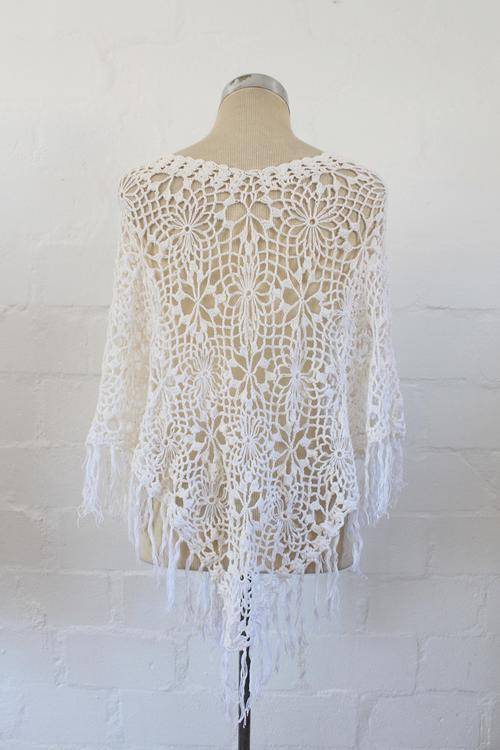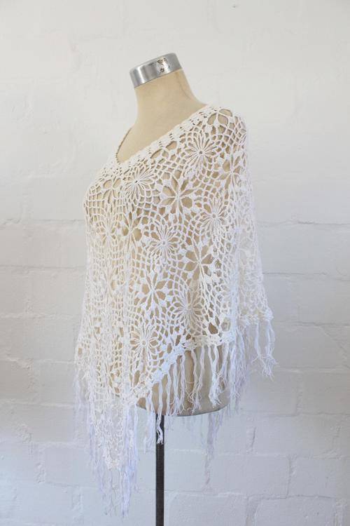 VINTAGE CROCHET JERSEY KNIT WHITE PONCHO SHAWL TOP - ONE SIZE