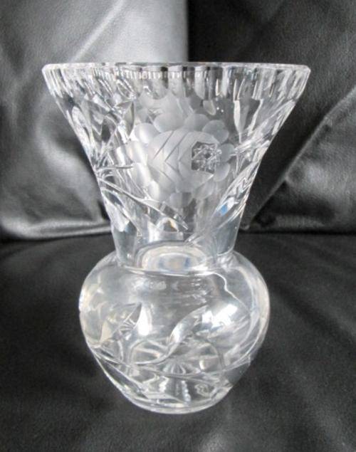 A lovely vintage solid rose cut crystal vase, with scalloped rim, in good used condition, 16 cm high, 11 cm diameter, 734 g weight.
