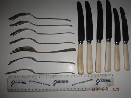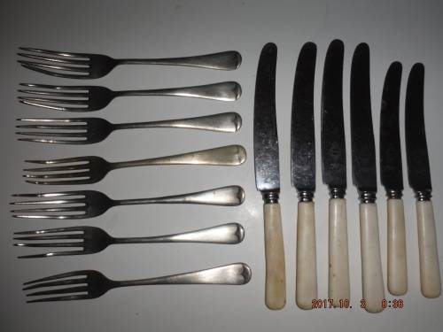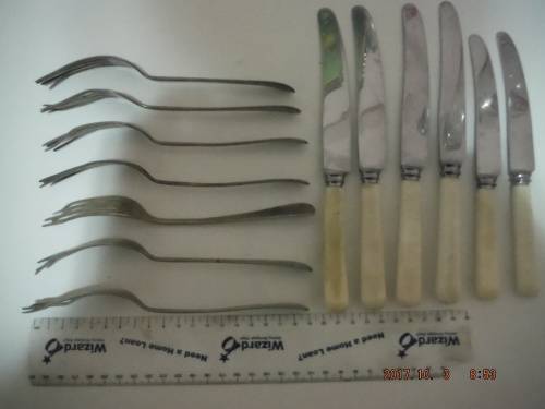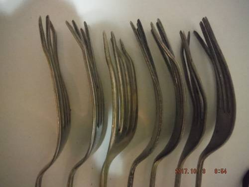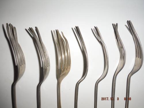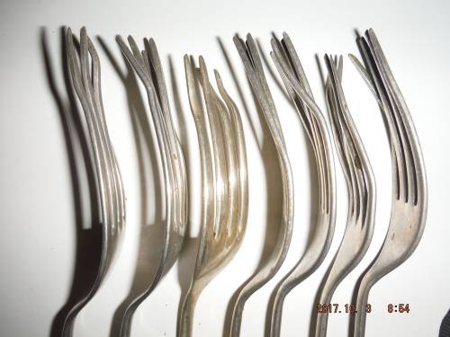 Forks X 7: prong are badly bend. Please see photos. "X-MS 98 SHEFFIELD ENGLAND" appears on 6 of them and "P&R. NICKEL SILVER" on 1 of them.