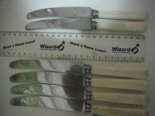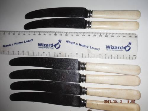 Knives X 6: The words "WARRANTED SHEFFIELD MAKE" in an emblim and "STAINLESS STEEL" appear on all of them.