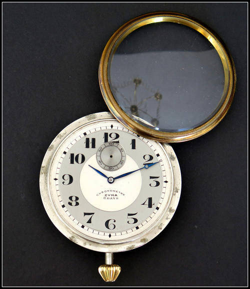 VINTAGE CYMA CHRONOMETRE, 8 DAY SWISS MADE TRAVELING CLOCK IN BROWN LEATHER CASE.