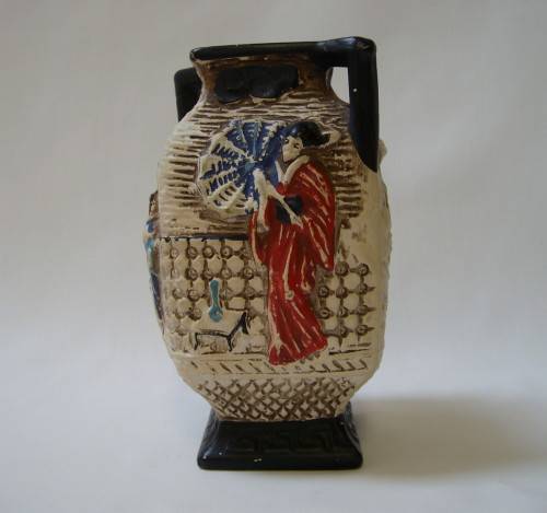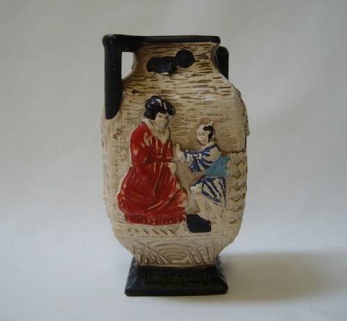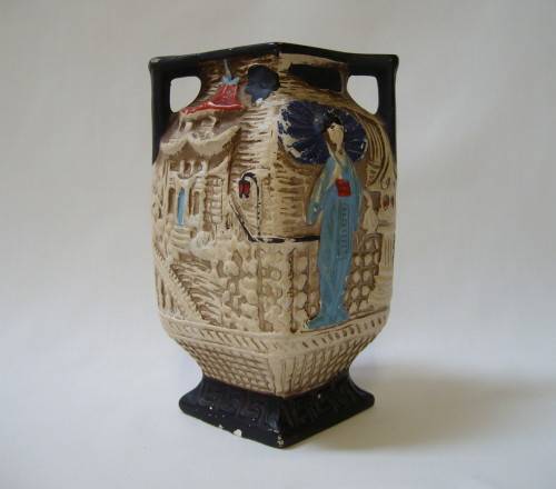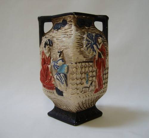 hand-painted images of Oriental ladies, moulded in relief, black handles and base.