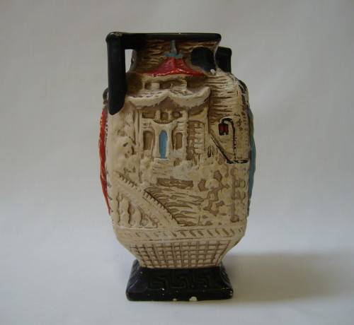 A shabby chic un-glazed ivory ceramic vase, decorated with various polychrome