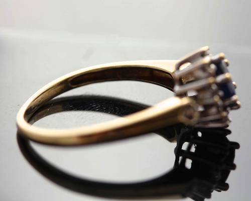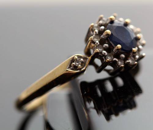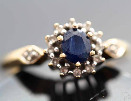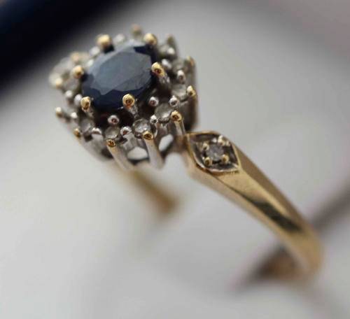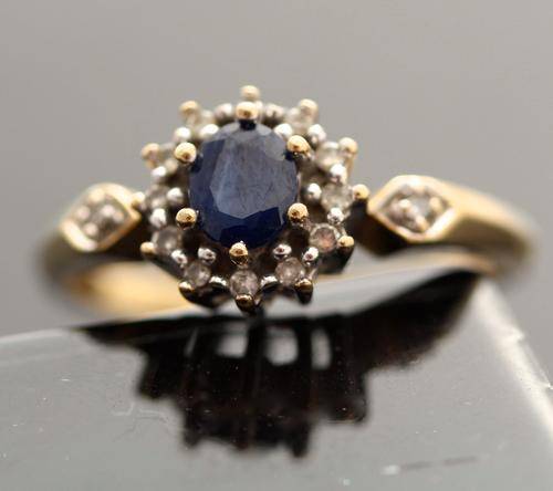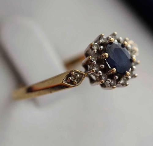This combination of sapphire and diamonds in a cluster design is one of those classic timeless designs that always holds its glamour! This lovely ring features a single brilliant cut 4 x 5 mm oval cut blue sapphire in the centre, which is surrounded by 12 x 1mm round cut natural diamonds and an additional diamond on each shoulder.  The diamonds are claw-set in 9 carat white gold. The sapphire is a little unusual. It has a distinct naturalness to it, more opaque than a lot of finely faceted stones. The colour is good - a striking deep blue - and when held to the light, there is an unusual inclusion set of parallel inclusions. The ring setting presents the head 5 mm above the finger.