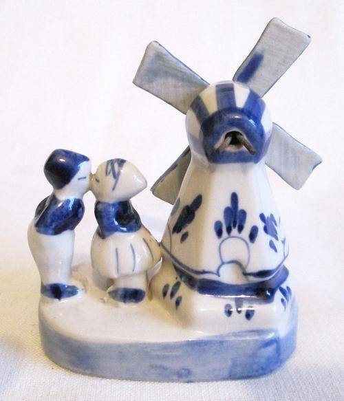 A lovely vintage hand painted Holland Delft blue and white porcelain windmill with kissing boy and girl. In good condition. Size 7 cm x 4 cm x 8.5 cm. Marked to base.